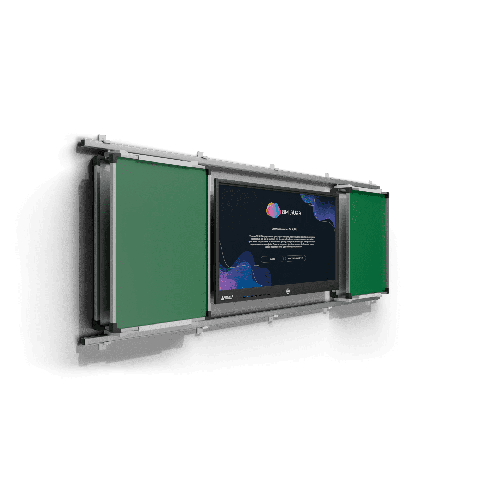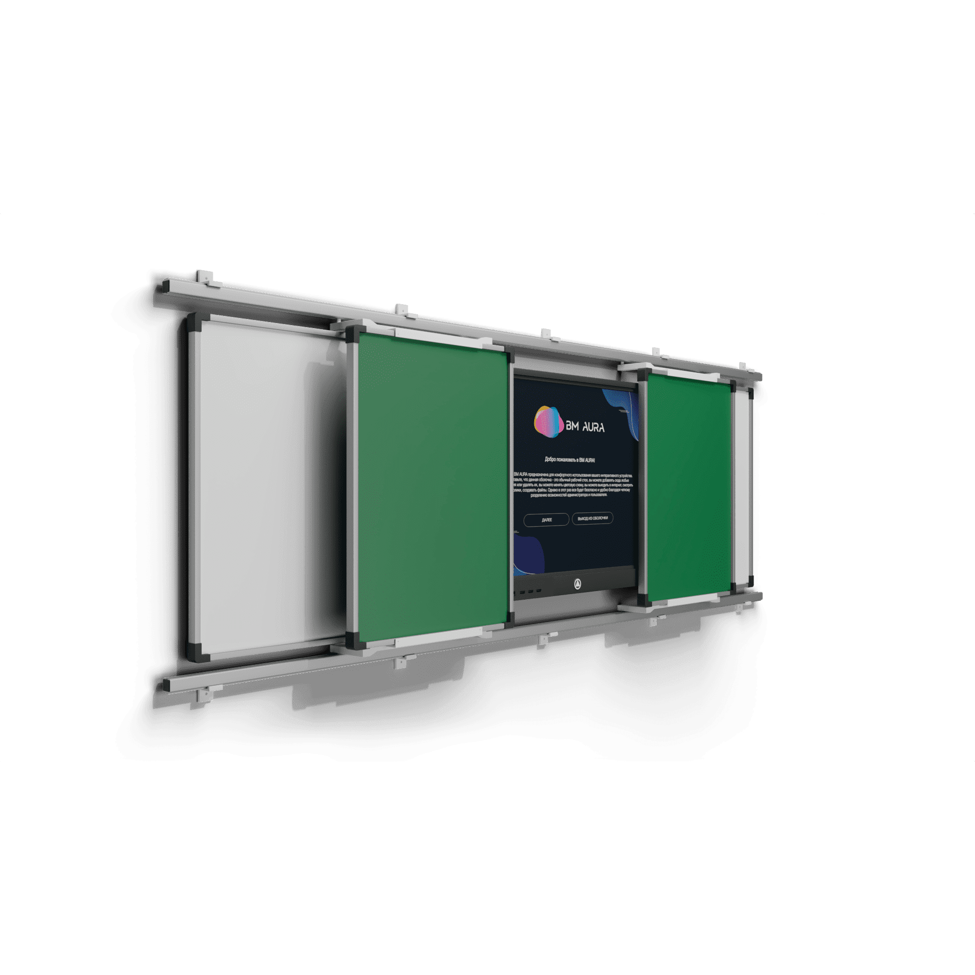 Система из раздвижных классных досок и интерактивной панели. Удобный в использовании комплект, предназначен для совмещения мультимедийных уроков и письма мелом. Передвижные элементы располагаются на рельсовых направляющих и легко раздвигаются в стороны. Настенные элементы крепятся к стене, увеличивая полезную площадь.
