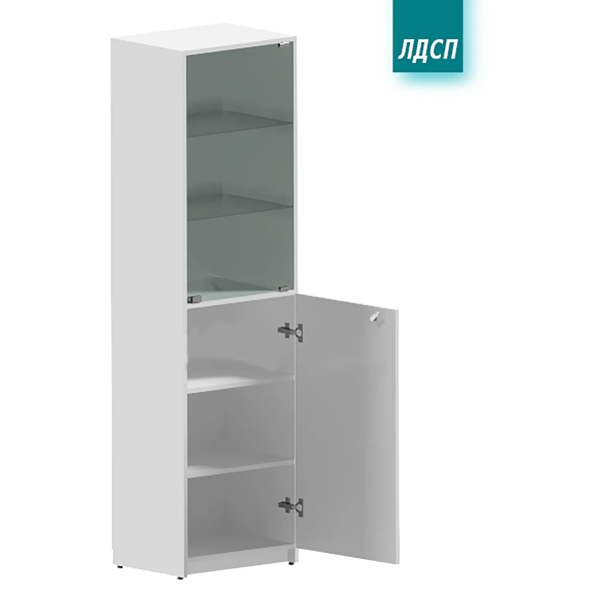 • Нижняя дверца из ЛДСП, верхняя дверца из стекла, 2 полки (в нижней секции) из ЛДСП, 2 полки (в верхней секции) из стекла