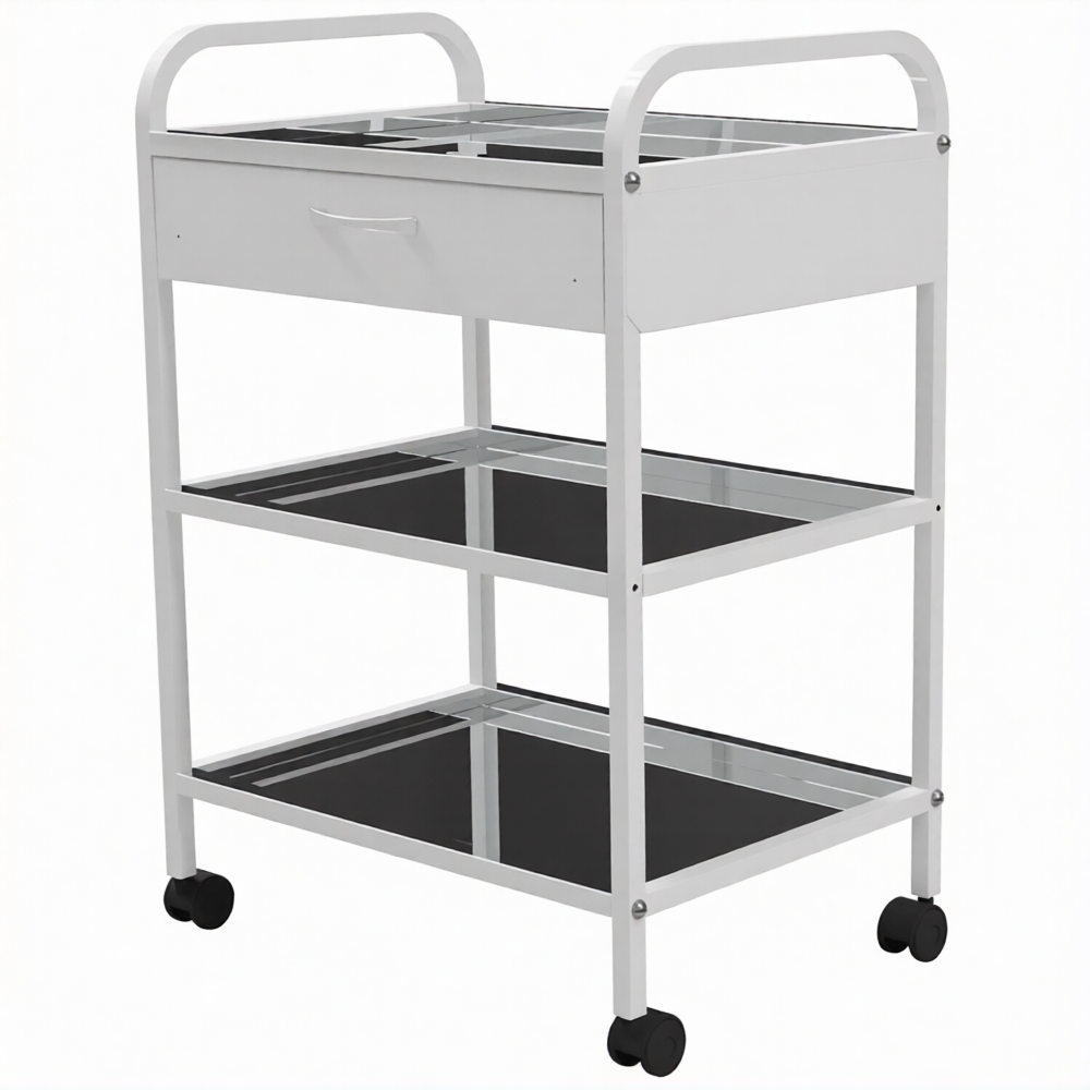 Стол медицинский инструментальный СМИ-03-01 (полки металл, колёса серая резина) предназначен для размещения инструмента, лекарственных препаратов и приборов.