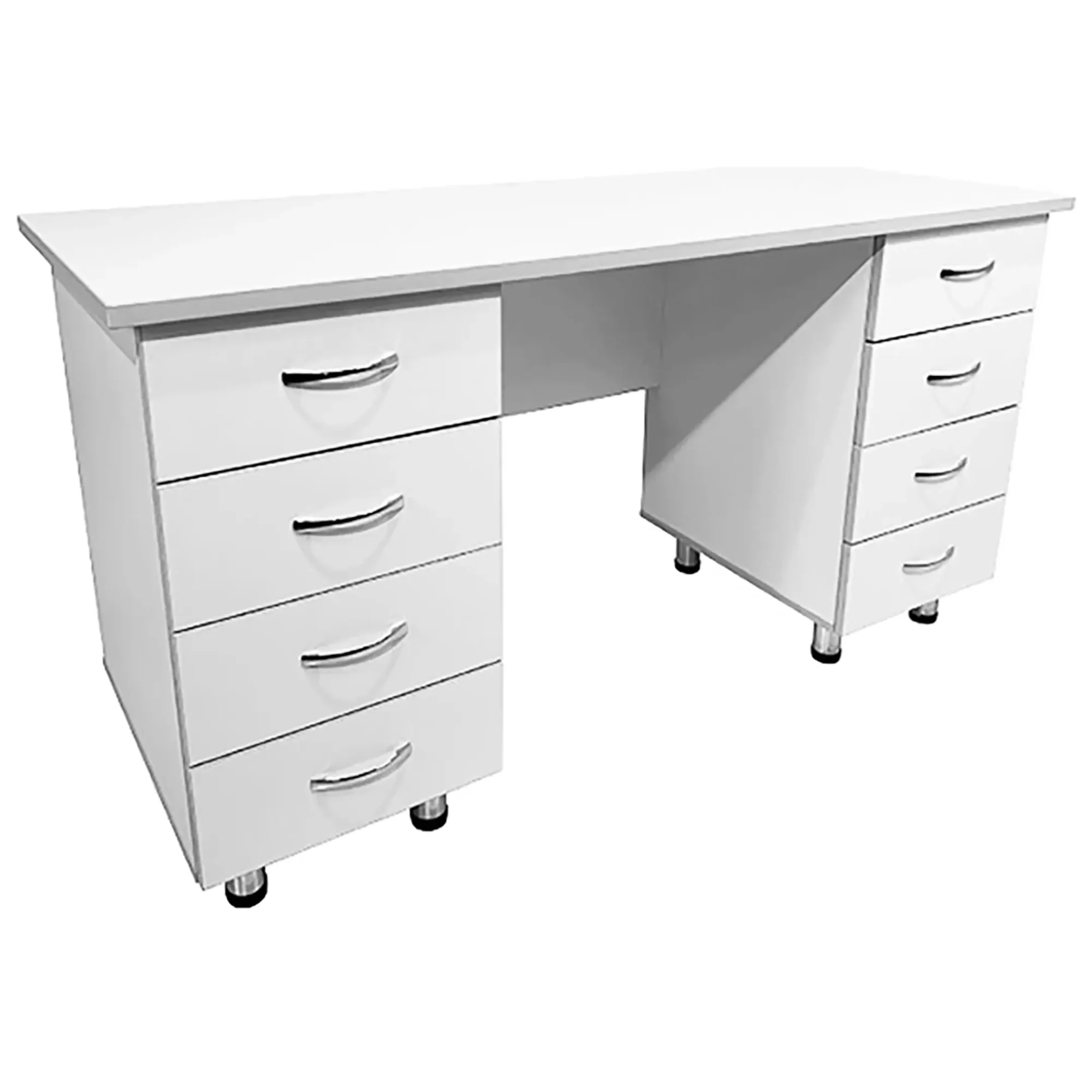 Ключевая особенность данной модели - наличие двух боковых тумб, каждая из которых оснащена четырьмя выдвижными ящиками. Это предоставляет удобное и организованное хранение документов, инструментов и других необходимых материалов. Сочетание белого цвета ЛДСП с светло-серой кромкой создает стильный и современный внешний вид стола.
