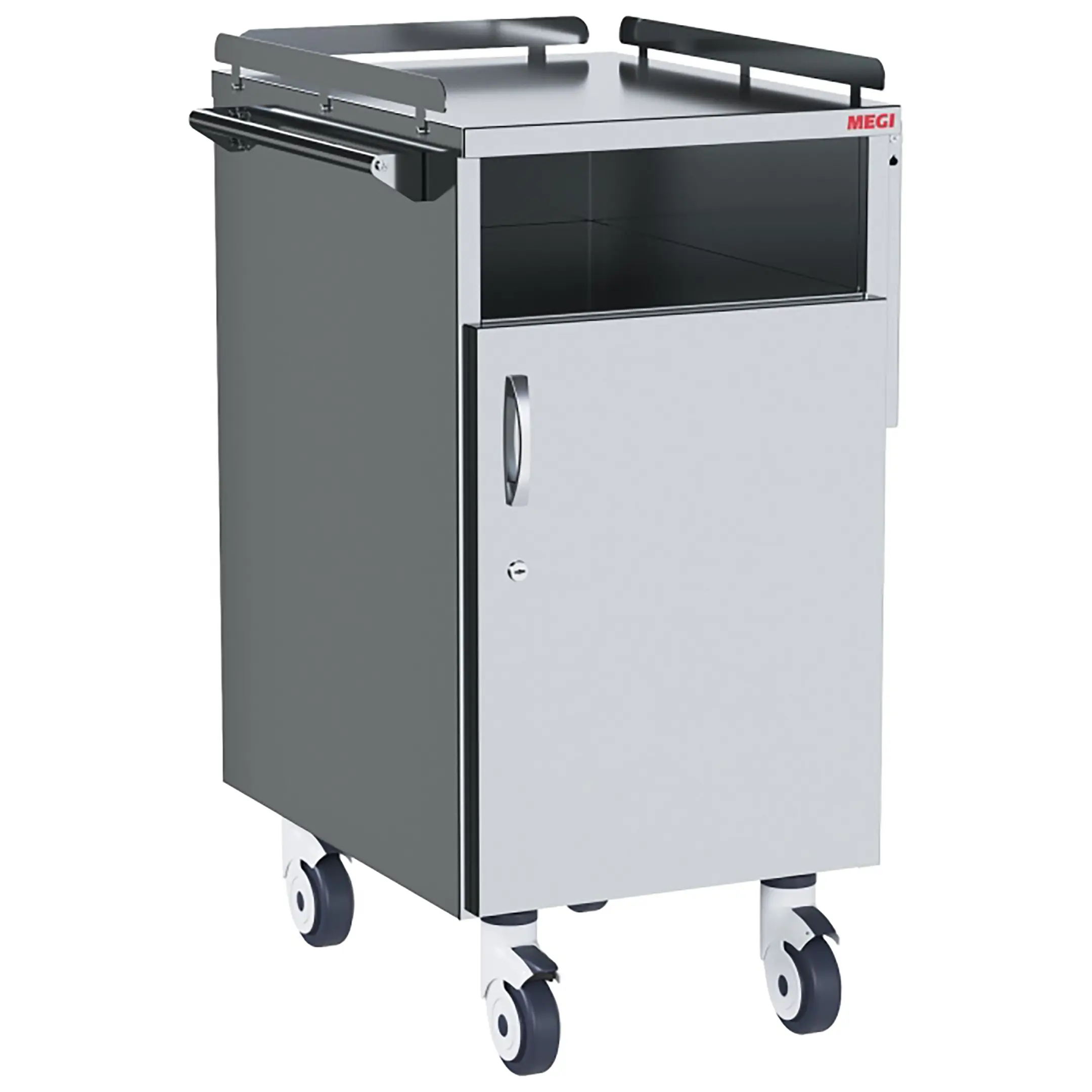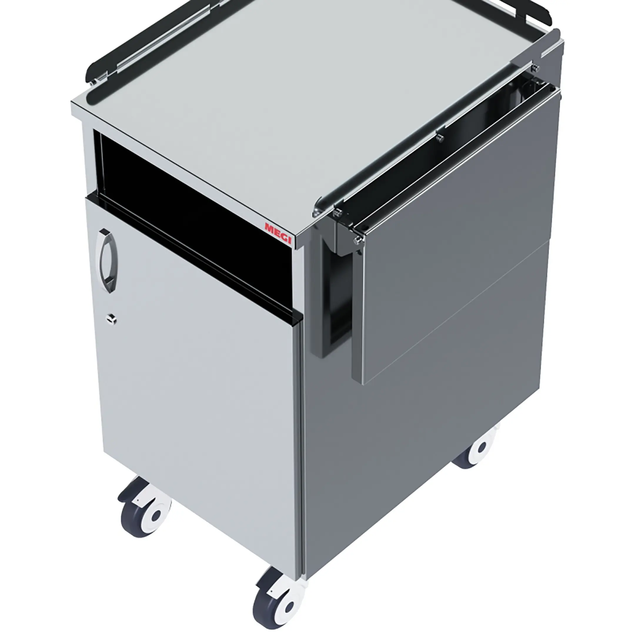 • колеса поворотные, самоориентирующиеся, диаметром 100 мм, комплектуются надёжной стальной вилкой с прецизионным радиально-упорным подшипником, ободом из полипропилена и шинкой из серого полиуретана, не оставляющего следов на полу, два колеса – с индивидуальным тормозным устройством;