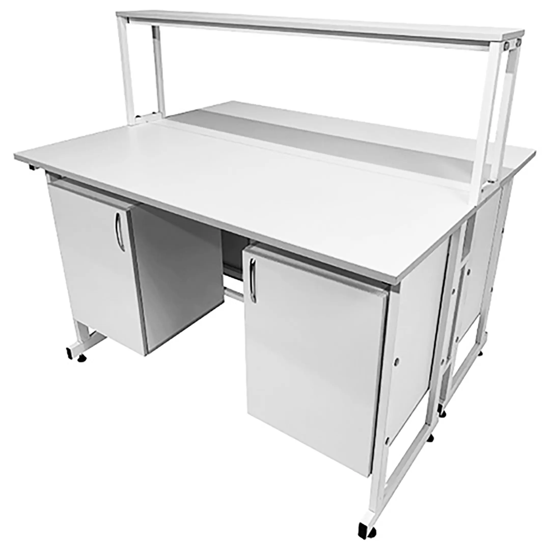Стол лабораторный островной с надстройкой Сло 22.010 (белый) — это универсальное и функциональное решение для создания двух полноценных рабочих мест, специально разработанное для использования в лабораториях и медицинских учреждениях. Модель оснащена двумя рабочими местами, каждое с двумя подвесными тумбами с распашными дверками и полками, а также центральной надстройкой с одной полкой. Каркас выполнен из стального профиля, столешницы из ЛДСП толщиной 22 мм.