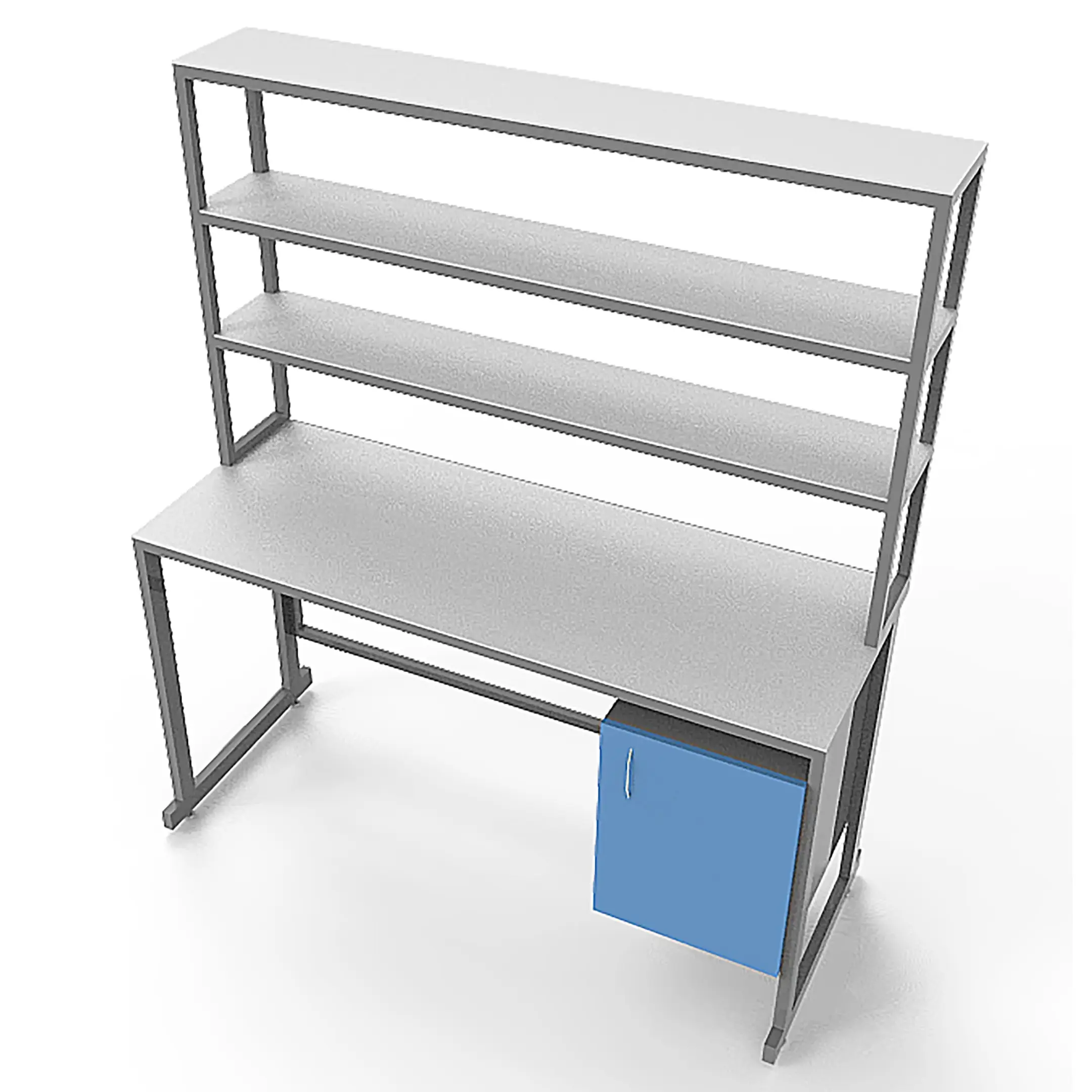 - Удобная система хранения — тумба под столешницей с распашной дверцей и надстройка с тремя полками для хранения материалов и оборудования.