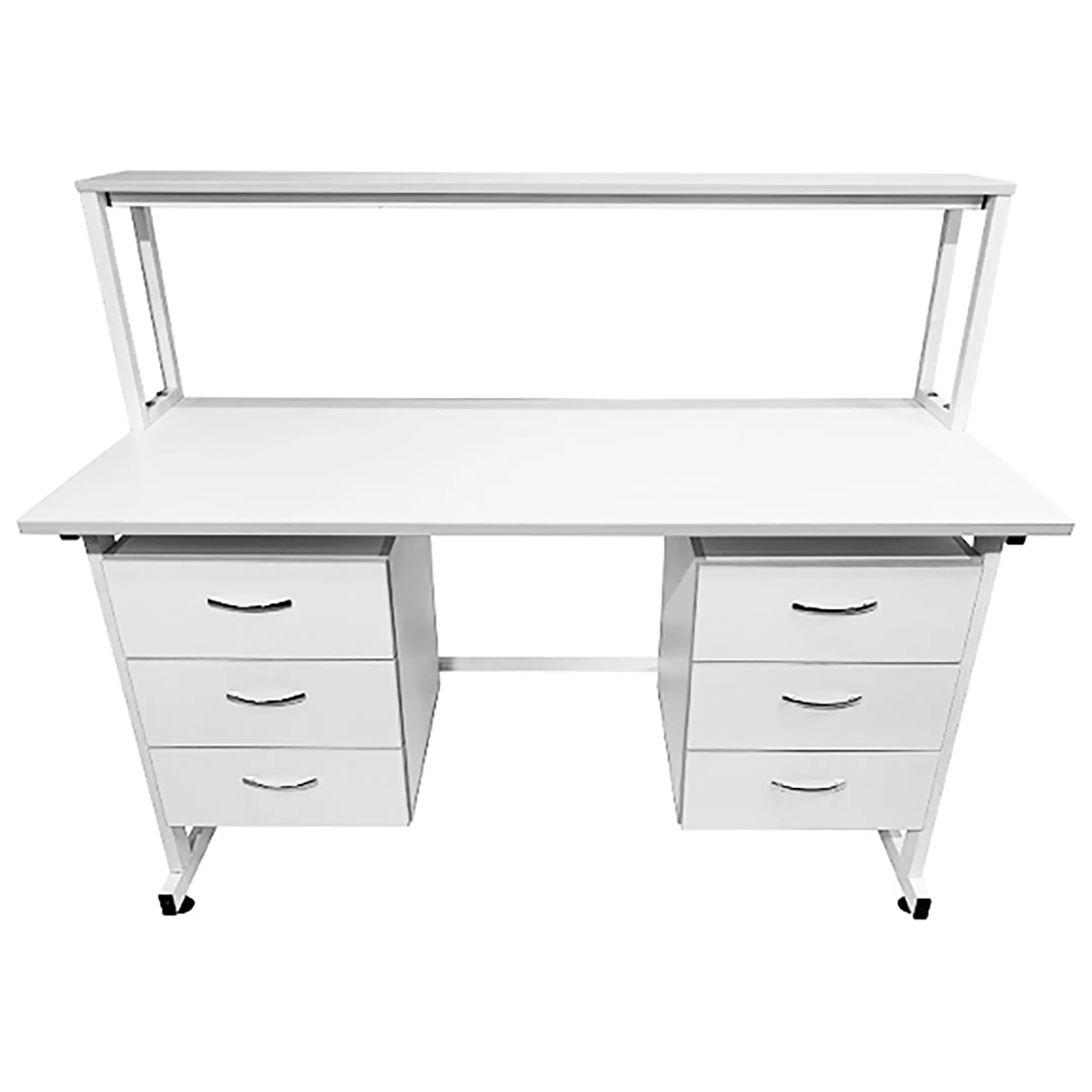 Стол лабораторный с надстройкой СЛн 16.015 (белый) — это идеальное решение для создания функционального и удобного рабочего места лаборанта, занимающегося проведением химических исследований. Модель оснащена двумя боковыми подвесными тумбами с тремя выдвижными ящиками каждая, надстройкой с одной полкой и металлическим защитным экраном. Каркас выполнен из стального профиля, столешница из ЛДСП толщиной 22 мм.
