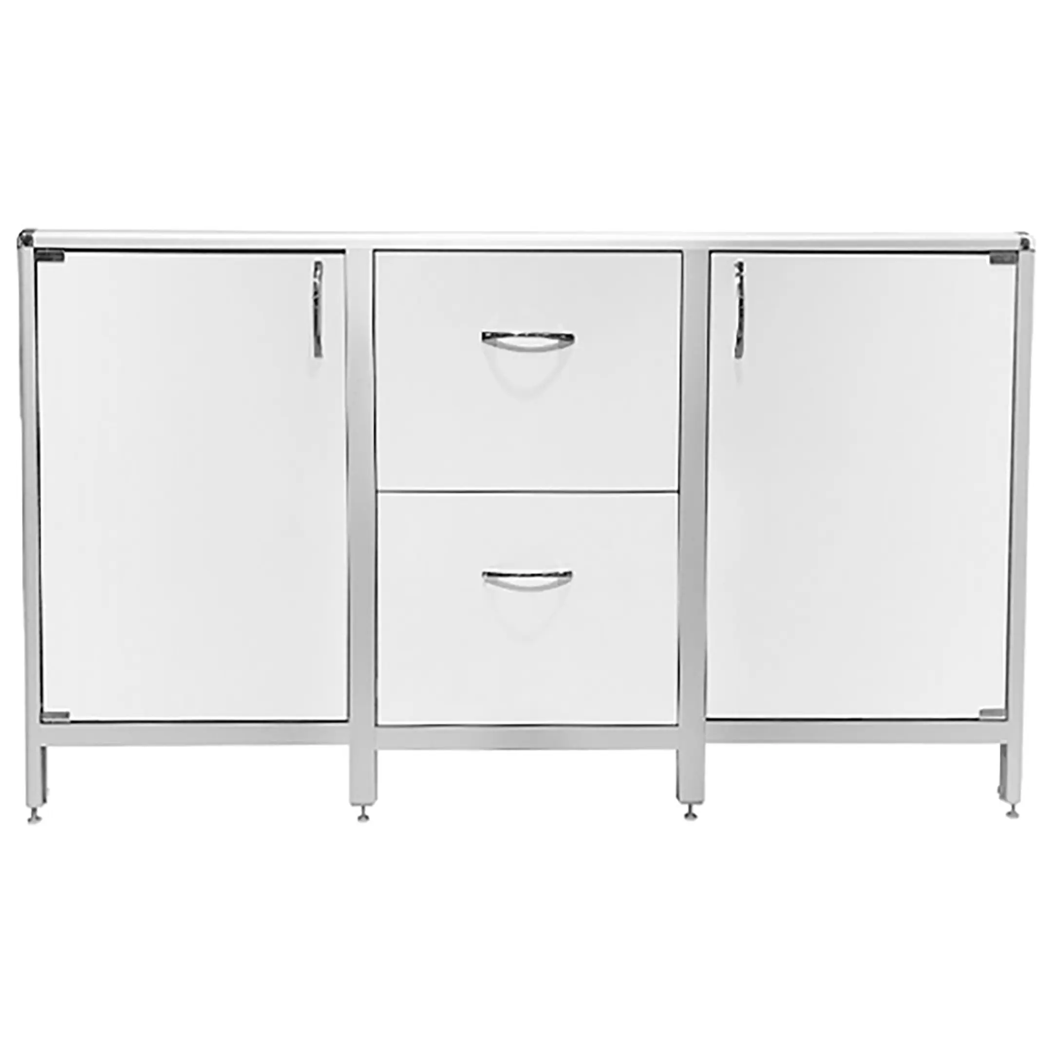 Стол-тумба лабораторная MED 12.017al (белый) — это функциональное решение для хранения лабораторного инвентаря, приборов и материалов в лабораториях и медицинских учреждениях. Модель разделена на три отдела: два боковых с дверками и полками (внутренние полки 467х545 мм), центральный с двумя выдвижными ящиками (434х260х410 мм). Каркас выполнен из алюминиевого профиля, столешница из ЛДСП толщиной 16 мм.