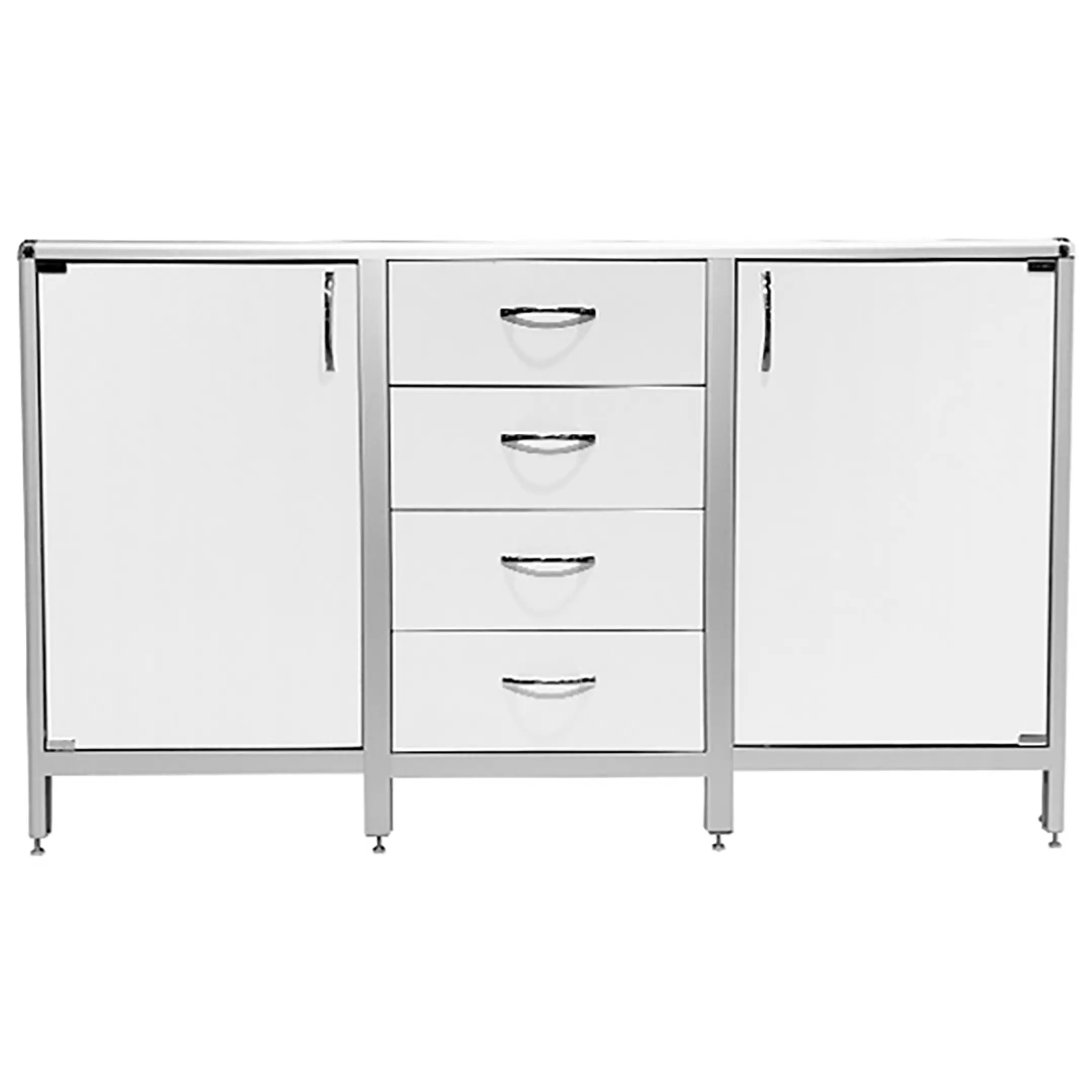 Стол-тумба лабораторная MED 12.021al (белый) — это функциональное решение для хранения лабораторного инвентаря, приборов и материалов в лабораториях и медицинских учреждениях. Модель разделена на три отдела: два боковых с дверкой и полкой, центральный с четырьмя выдвижными ящиками. Каркас выполнен из алюминиевого профиля, столешница из ЛДСП толщиной 16 мм.