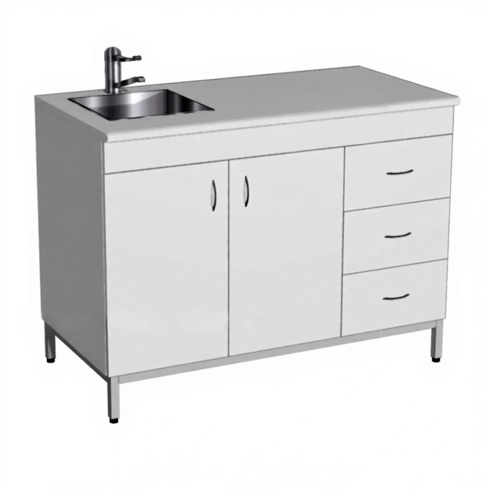 Стол-мойка СТм-108 «Стандарт» 1200 (корпус ЛДСП серый, столешница постформинг серый, каркас серый) — это необходимая составляющая для оснащения рабочей зоны, обеспечивающая удобство и безопасность труда специалистов-исследователей в кабинетах лабораторий. Модель предназначена для мытья и сушки лабораторной посуды. Оснащена одночашевой врезной мойкой из нержавеющей стали, локтевым смесителем и комбинированной системой хранения: в левой секции две дверки, в правой — три выдвижных ящика. Каркас выполнен из стального профиля, столешница из постформинга 26 мм, корпус из ЛДСтП 16 мм.