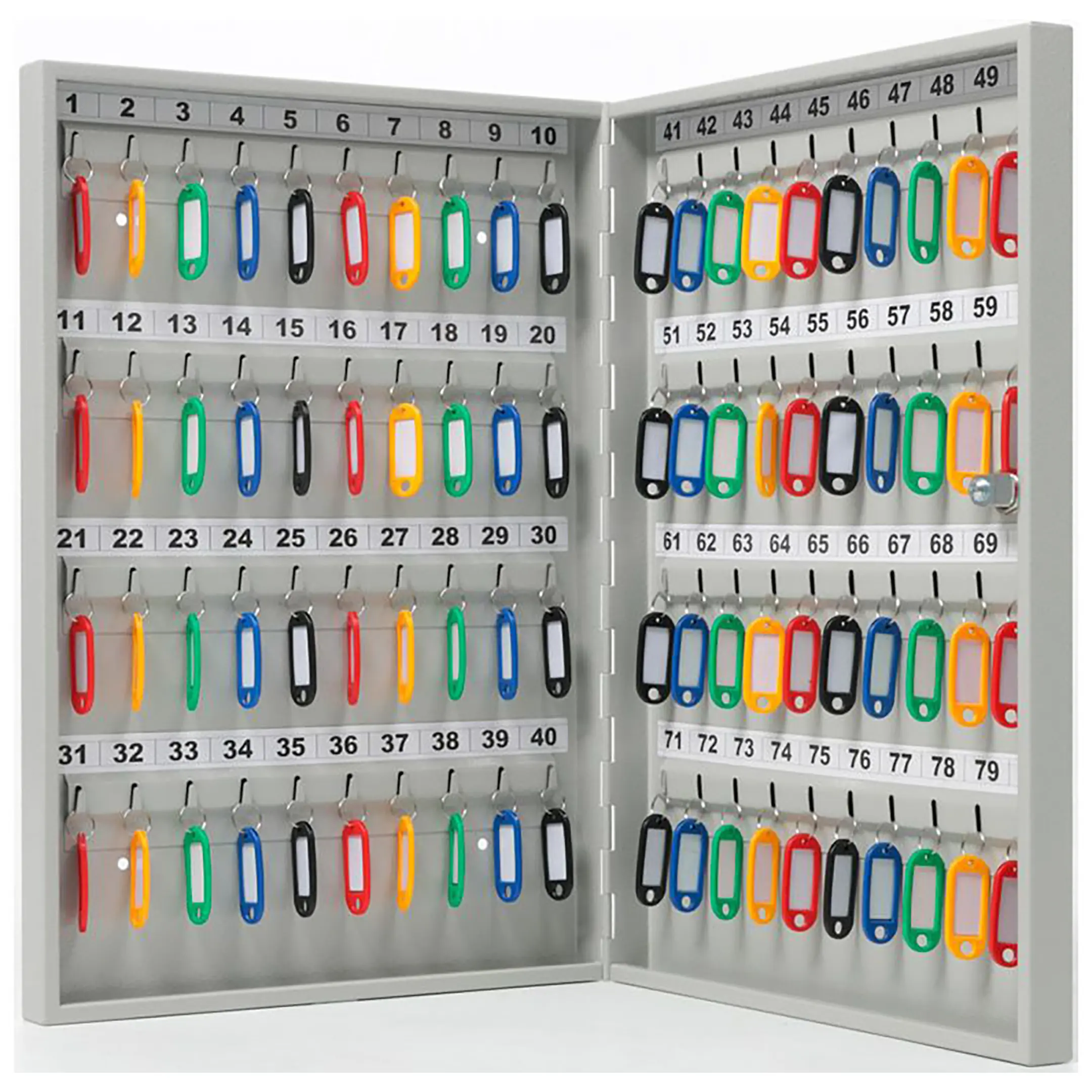 - Эффективная организация и быстрый поиск — восемьдесят пронумерованных ячеек и комплект брелков создают четкую и прозрачную систему. Это позволяет мгновенно находить нужный ключ, вести точный журнал учета и легко контролировать их выдачу и возврат ответственными лицами, повышая операционную эффективность.