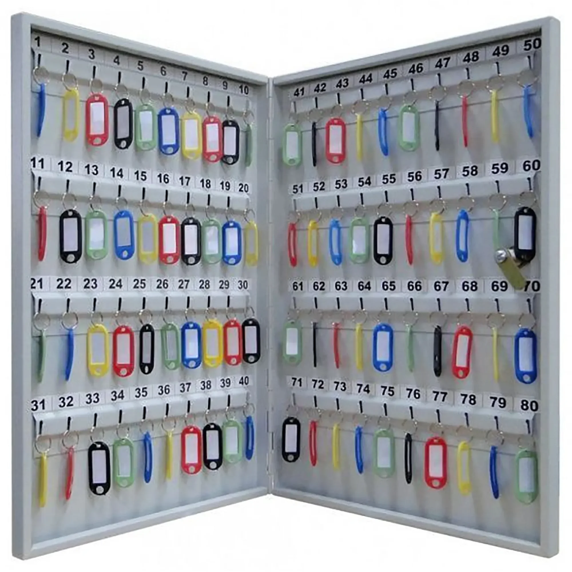 - Четкая система учета и быстрого поиска — восемьдесят пронумерованных ячеек и комплект соответствующих брелков создают прозрачную и удобную систему. Это позволяет вести точный журнал движения ключей, мгновенно находить требуемый экземпляр и однозначно определять ответственность сотрудников за их выдачу и возврат.