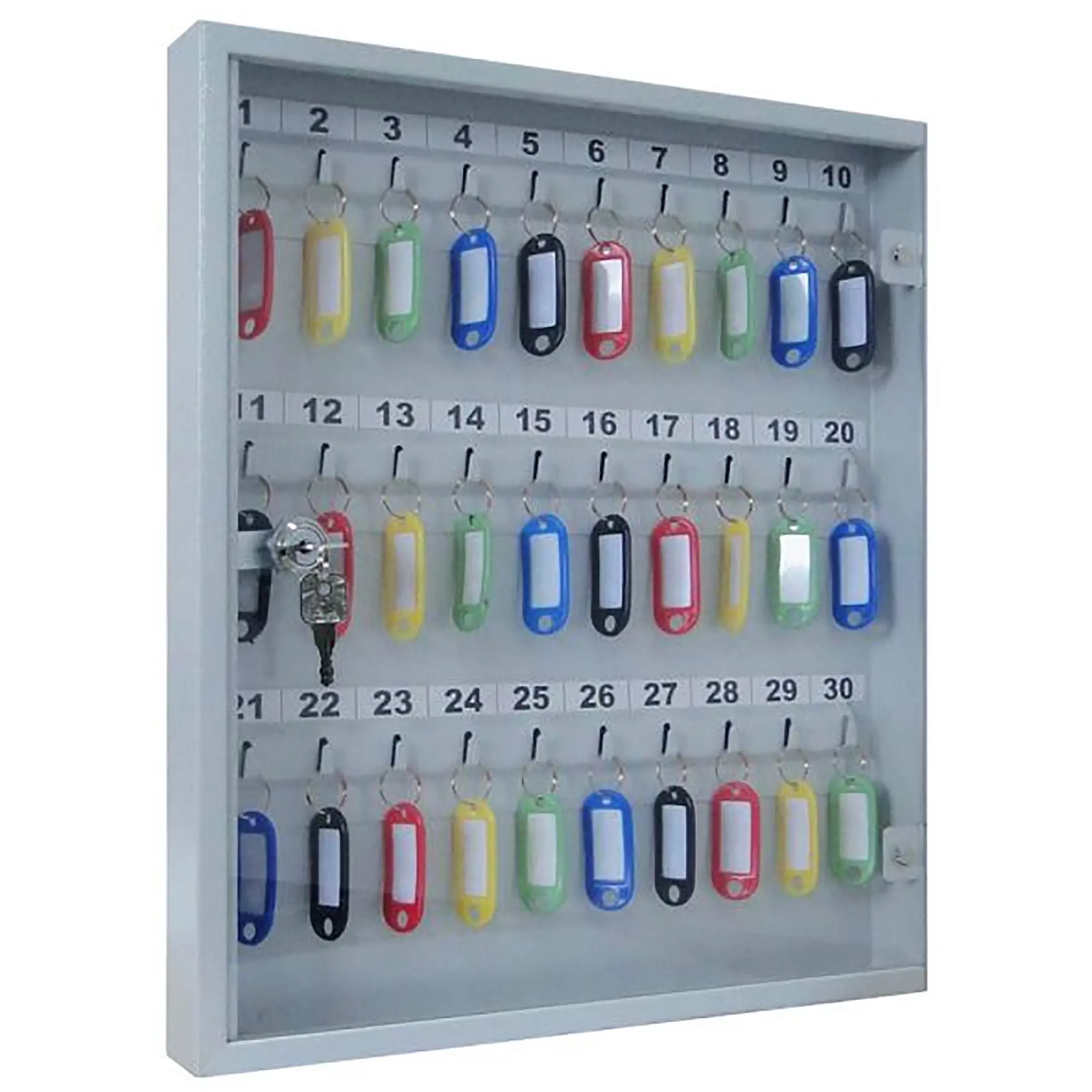 Ключница с прозрачной дверцей КЛС-30 (с брелками) — это практичная и наглядная система для организованного хранения ключей в учреждениях и на предприятиях. Конструкция со стеклянной дверцей и полным комплектом брелков обеспечивает удобный визуальный контроль, быстрый поиск и надежную защиту для 30 комплектов ключей.