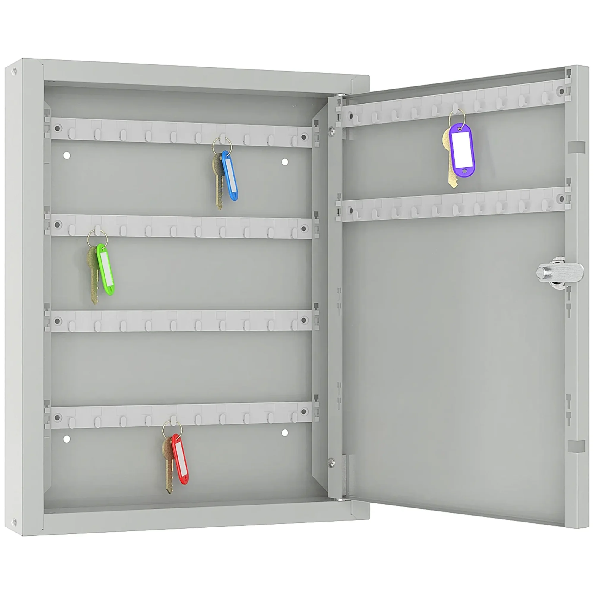 - Надежная защита от несанкционированного доступа — прочный металлический корпус с замком обеспечивает базовый, но достаточный уровень безопасности, защищая ключи от кражи, потери или случайного повреждения. Это важный элемент для поддержания контроля над доступом в служебные помещения и к оборудованию.