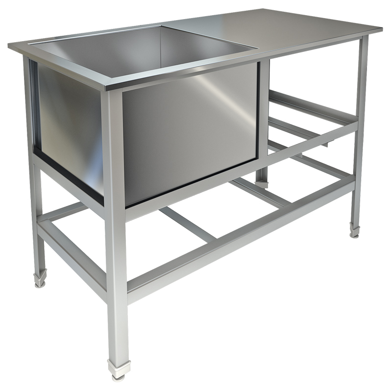 Каркас ванны моечной снабжен горизонтальными направляющими, обеспечивающими дополнительную жесткость конструкции. Высота ножек регулируется за счет специальных механизмов.