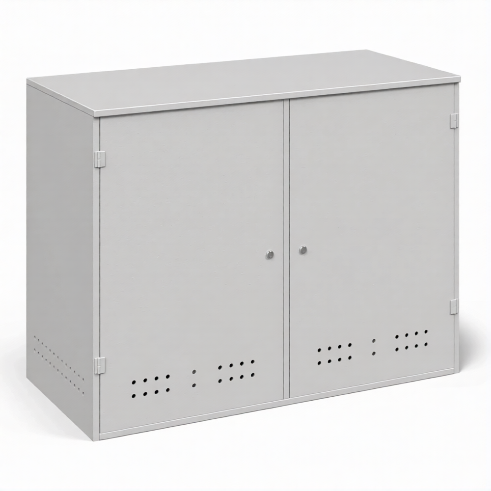 - Обеспечение высочайшего уровня пожарной безопасности — шкаф изготовлен из огнестойкого металла и служит для надежной изоляции газового баллона от источников открытого огня и тепла. Система вентиляции (перфорация в нижней и верхней зонах) обеспечивает постоянный воздухообмен и безопасный отвод газа при утечке, предотвращая образование взрывоопасной концентрации.