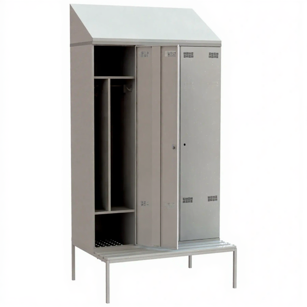 - Шкаф металлический для хранения одежды имеет сварную конструкцию. Для удобства проведения влажной уборки под шкафом модель установлена на подставку. Для удобства переодевания имеет скамью