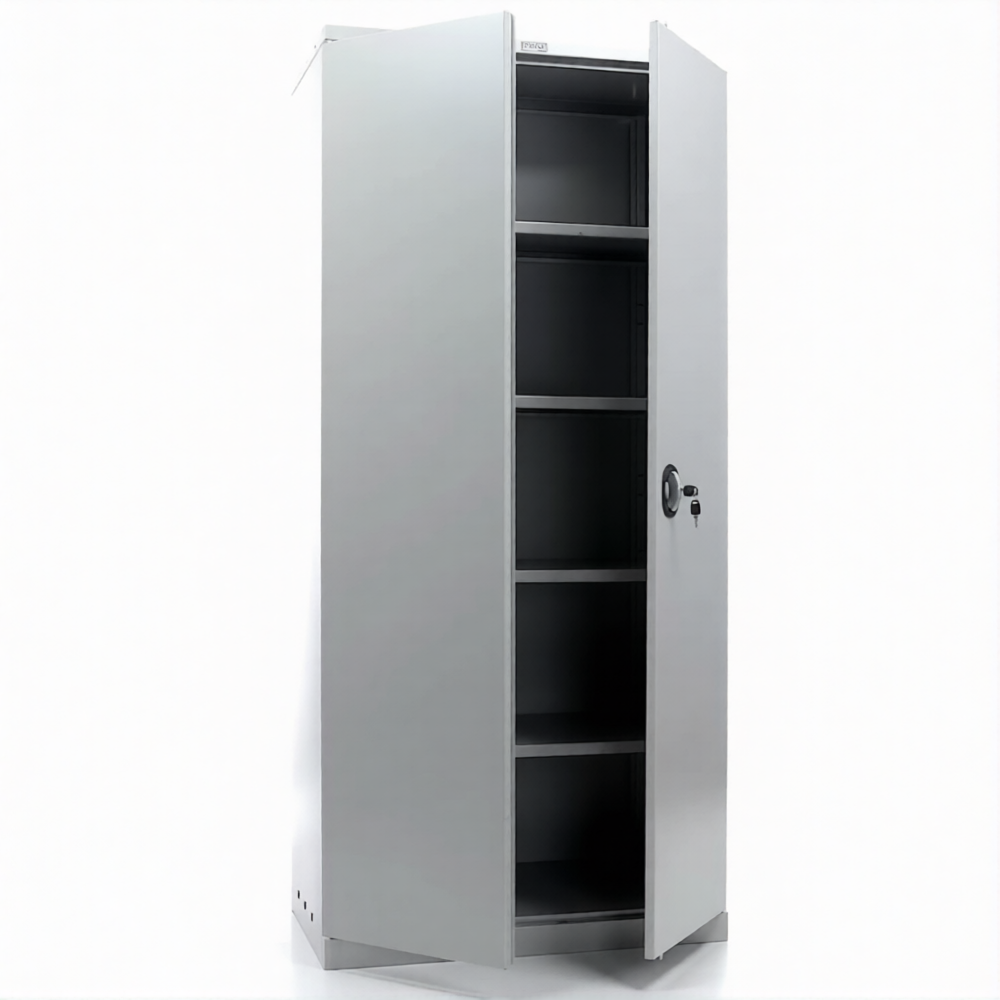 - имеет распашные двери, ключевой замок, регулируемые полки, фурнитуру;