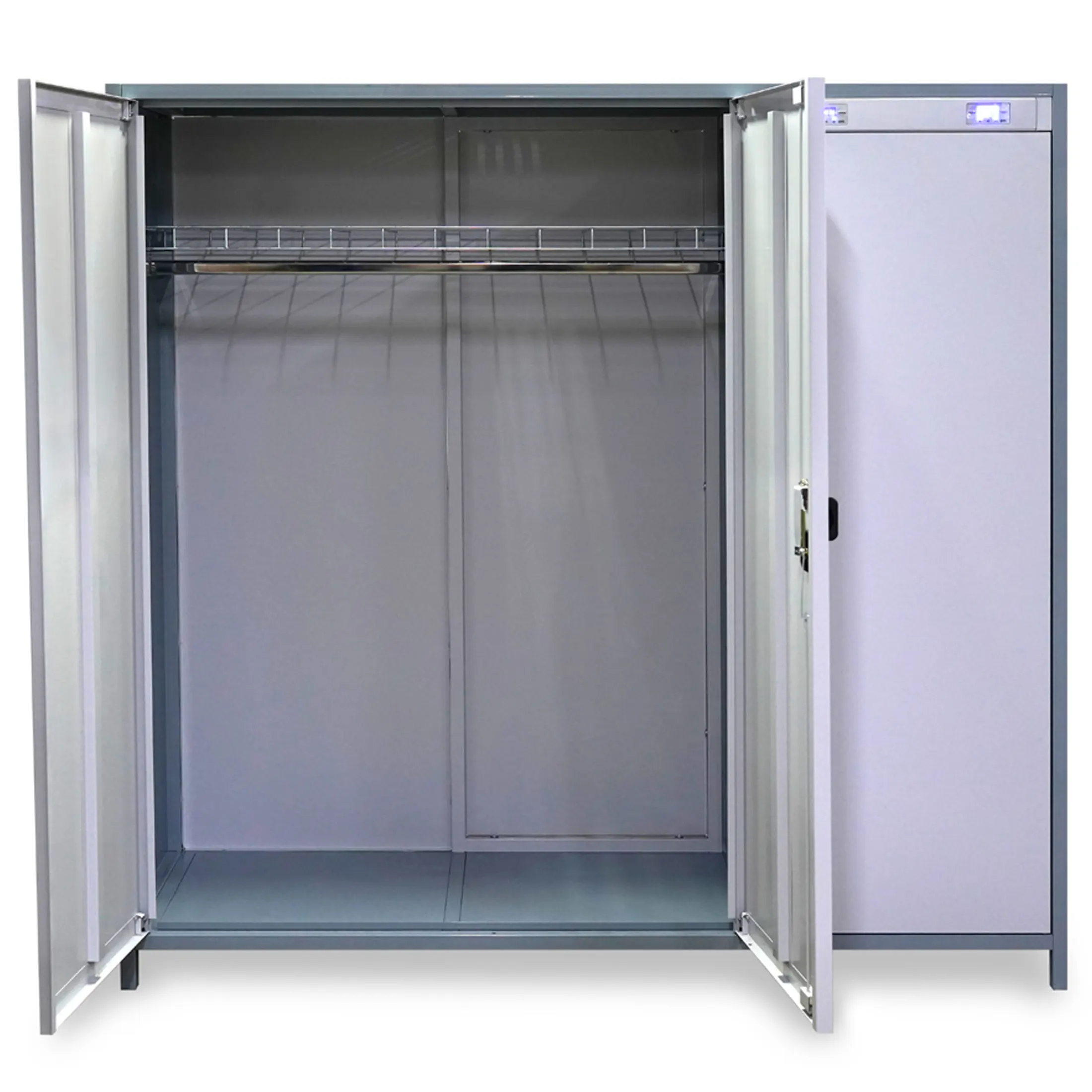 - Высокая производительность и вместимость — шкаф рассчитан на загрузку значительных объемов одежды и обуви за один цикл, что позволяет эффективно обслуживать большие коллективы на предприятиях, в спортивных комплексах или медицинских стационарах.