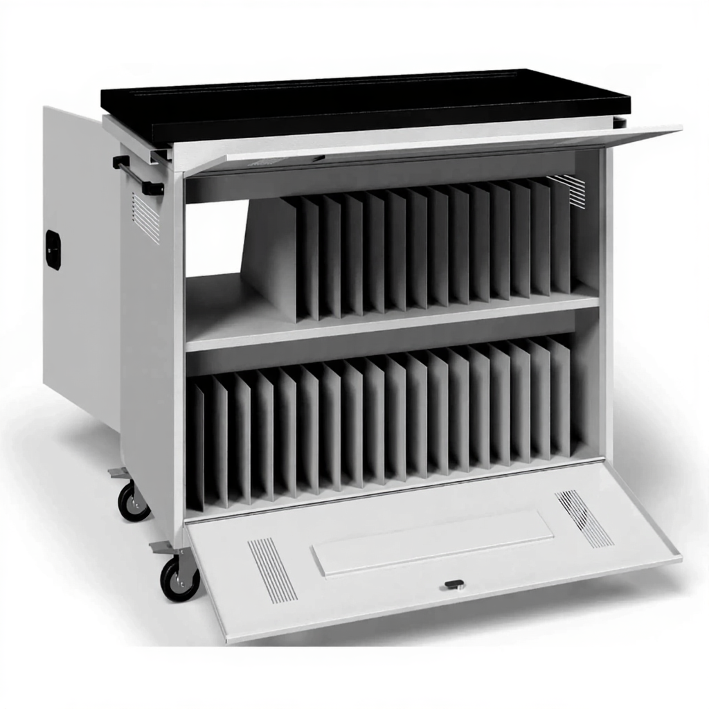 - Интеллектуальная система синхронной зарядки — встроенная электросхема обеспечивает безопасную одновременную зарядку всех 31 ноутбуков от одной розетки, с распределением нагрузки, защитой от скачков напряжения и возможностью контроля процесса.